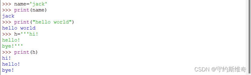 字符串就是由多个字符的集合、拼接构成的。字符串必须由双引号" "或者单引号' '甚至可以用三引号''' '''包裹起来。这个就比较有意思了,其规律就是,如果是想表示单行的字符串我们就用单引号或者双引号,如果是多行字符串的话,我们就可以用三个单引号(这个不是注释哦,就是一个引号)
