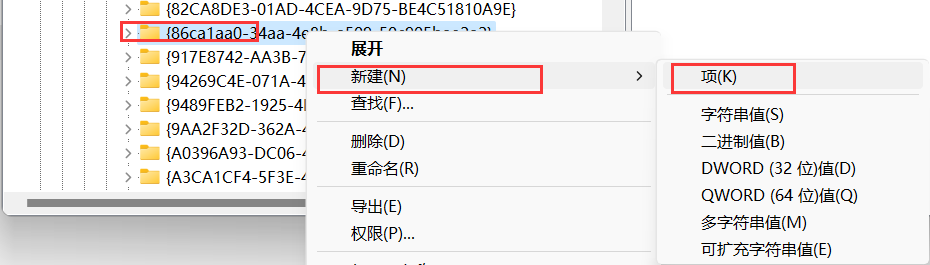 右键点击CLSID项,新建→项,命名为{86ca1aa0-34aa-4e8b-a509-50c905bae2a2},按下回车键保存: