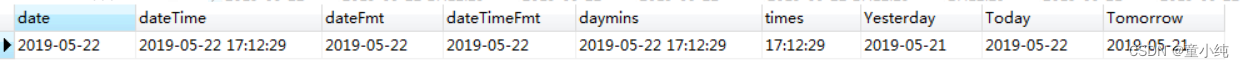 SELECTCURDATE( ) date,now( ) dateTime,DATE_FORMAT( now( ), '%Y-%m-%d' ) dateFmt,DATE_FORMAT( now( ), '%Y-%m-%d' ) dateTimeFmt,DATE_FORMAT( now( ), '%Y-%m-%d %H:%i:%s' ) daymins,CURTIME( ) times,date_sub( CURDATE( ), INTERVAL 1 DAY ) Yesterday ,date_sub( CURDATE( ), INTERVAL 0 DAY ) Today ,date_sub( CURDATE( ), INTERVAL 1 DAY ) Tomorrow