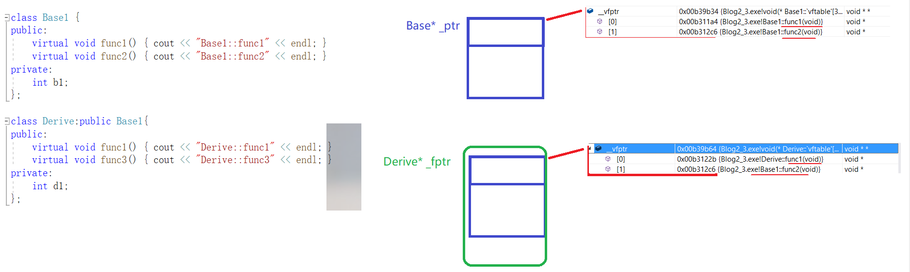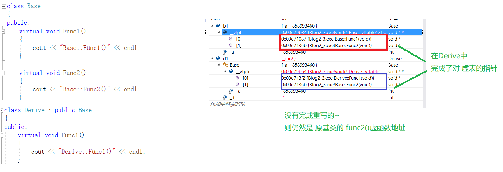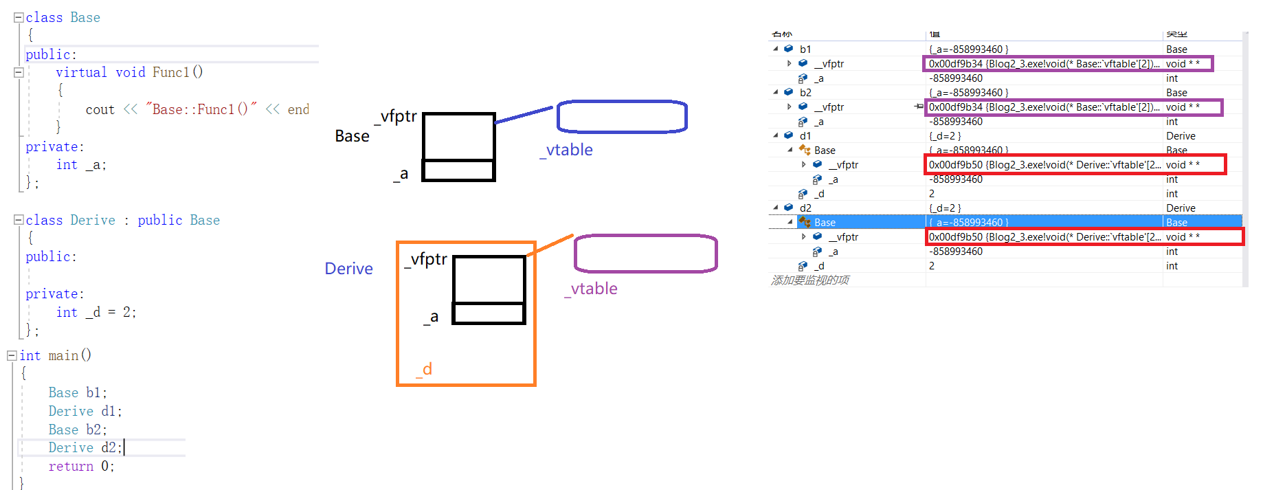 在图示中,我们清晰地看到,相同的类它的虚表指针是固定的,即它们共享一份虚函数表。不同的类,有不同的虚表指针。
