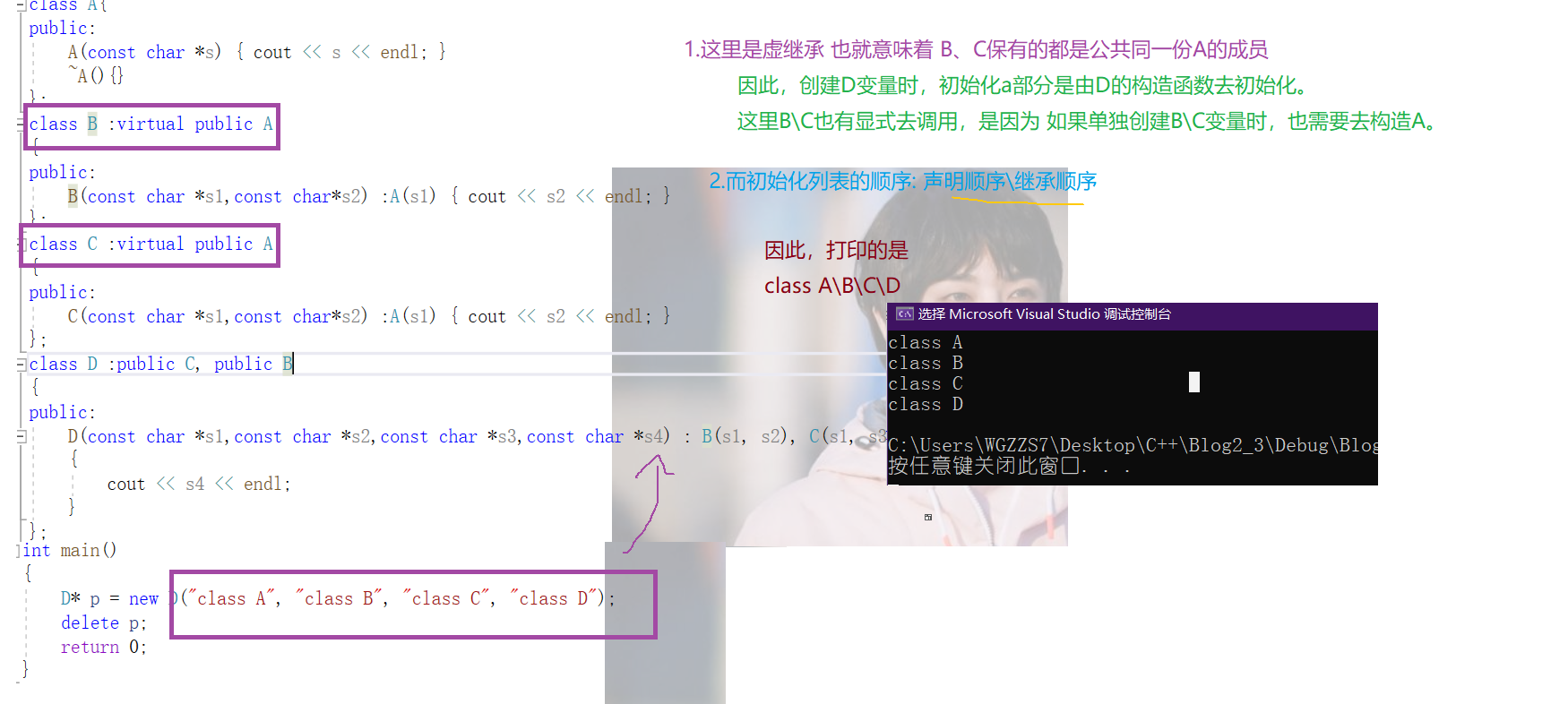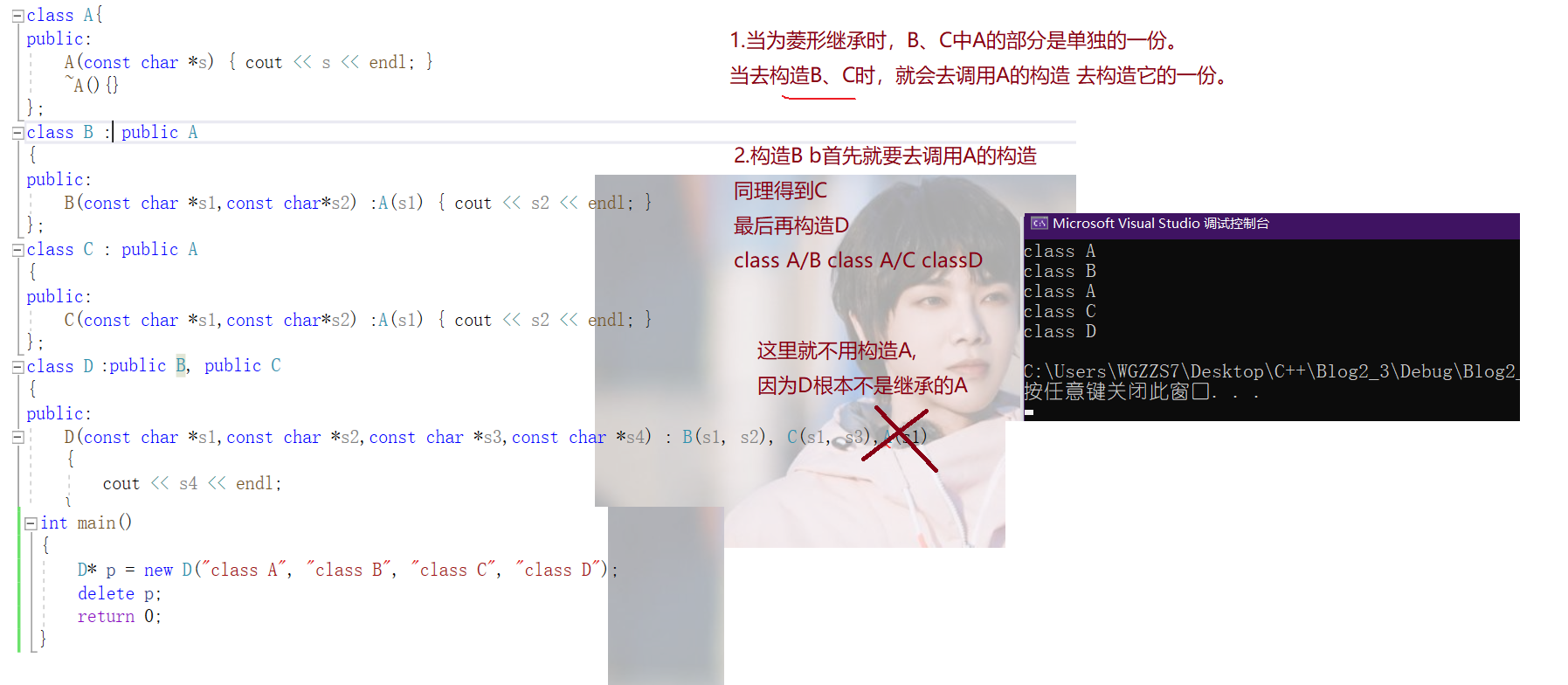 因为在B、C中A的部分都是一个。因此,让B、C其中哪一个去构造都不太合适,因为两人都合适,并且A的部分是公共的。所以,这个任务就交由D一定要去显式调用A的构造。完成对那部分的初始化。