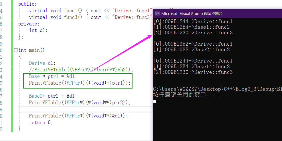 {for (int i = 0; vft[i] != nullptr; ++i){printf("[%d]:%p->", i, vft[i]);//我们拿到了函数的地址 就可以去调用函数vft[i]();}cout << endl;