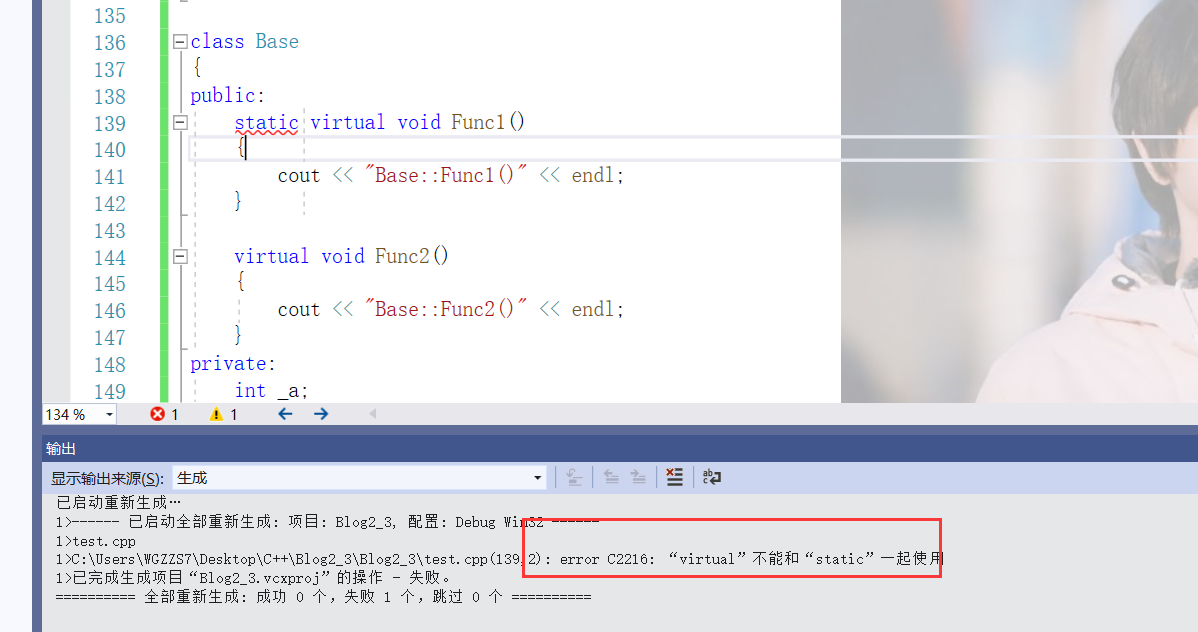 我们写出来编译器就立马报错。静态成员函数最显著的一个特征时,可以不需要类对象的创建,就可以调用的函数,也就是该函数没有this指针。没this指针你怎么访问虚函数表,调用虚表指针呢?