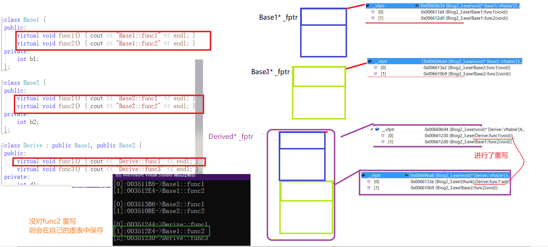 此外,多继承的派生类为重写的虚函数,会放在第一个继承的基类部分的虚函数表中。