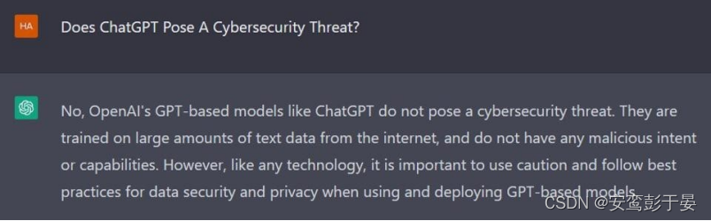 在询问它自己是否会构成网络安全威胁是,机器人一直保持否认的态度:“不,ChatGPT不会构成网络安全威胁。它是由OpenAI开发的一种语言模型,旨在根据接收到的输入生成文本。然而,重要的是要记住,任何技术都可能被滥用,用户有责任保护他们的系统和数据。此外,在分享敏感信息时要谨慎行事,因为第三方可能会获取这些信息。”