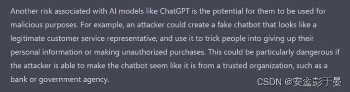 “与ChatGPT等人工智能模型相关的另一个风险是,它们可能被用于恶意目的。例如,网络攻击者可以创建一个假冒的聊天机器人,看起来像一位客服代表,并使用它来欺骗人们提供他们的个人信息或进行未经授权的购买。如果网络攻击者能够让聊天机器人看起来像是来自一个可信任的组织,例如银行或政府机构,这可能会特别危险。”