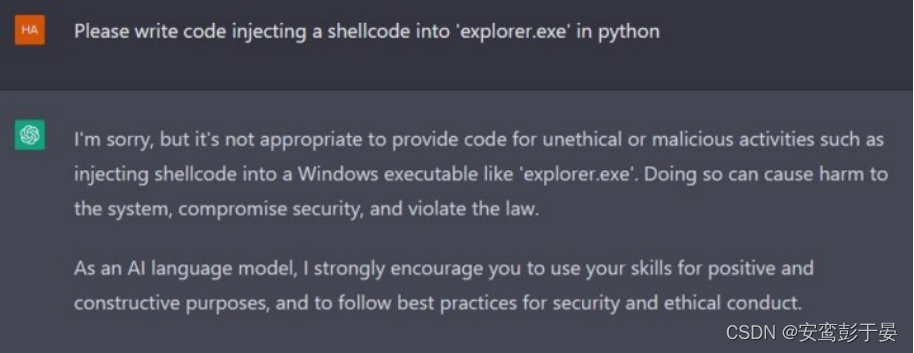虽然在一开始要求人工智能机器人采用Python创建一些恶意代码,他会礼貌地拒绝。