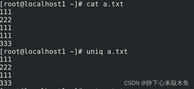 只会去除相邻的重复行,不相邻的重复行不会去除