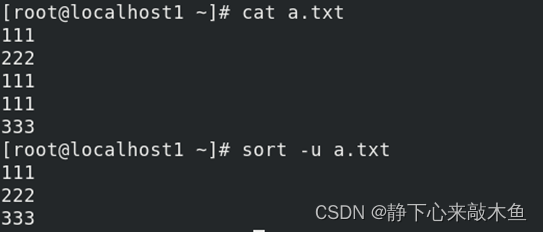 -u 去除重复行(uniq是去除连续的相同行,sort -u是只要有相同的行就会去除)
