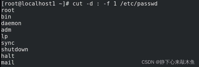 cut -d : -f 1 /etc/passwd 以:为间隔符,显示第一列的信息,提取/etc/passwd文件中用户的名字分别是什么