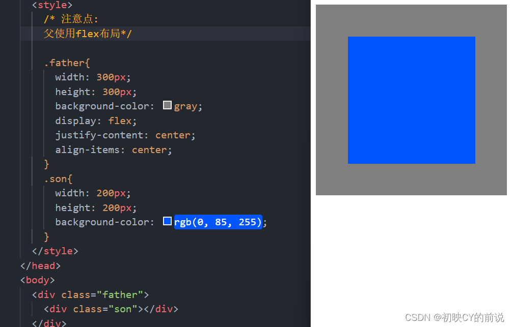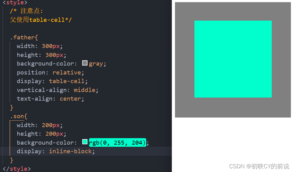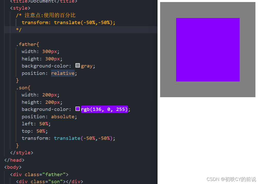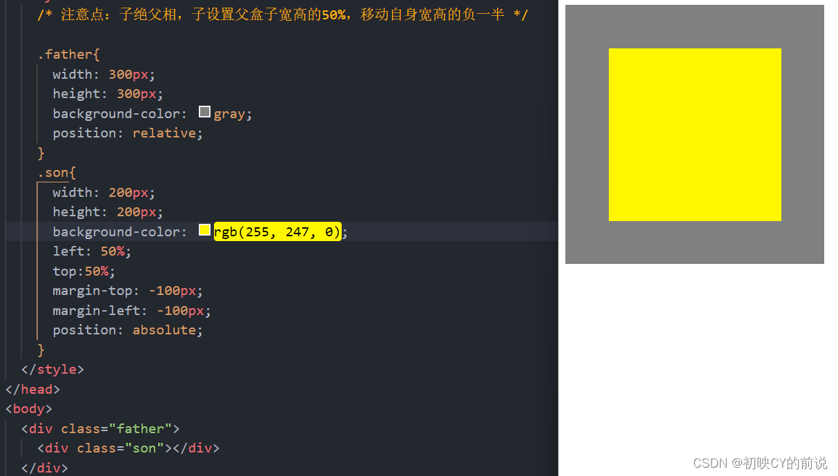 注意点:子绝父相,子设置父盒子宽高的50%,移动自身宽高的负一半