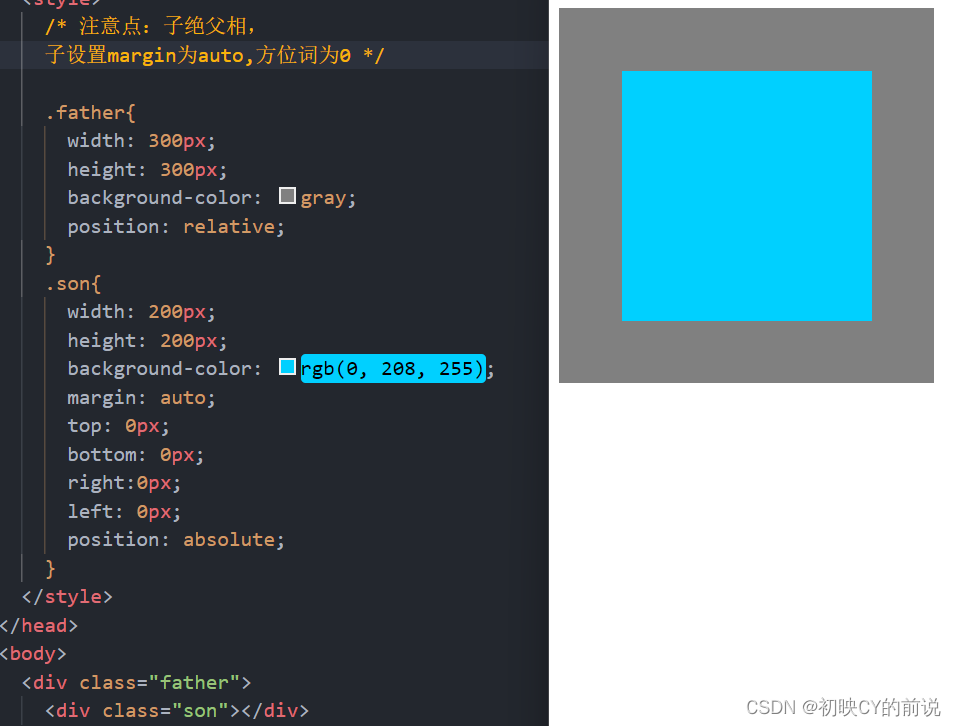 注意点:子绝父相,子设置margin为auto,方位词为0