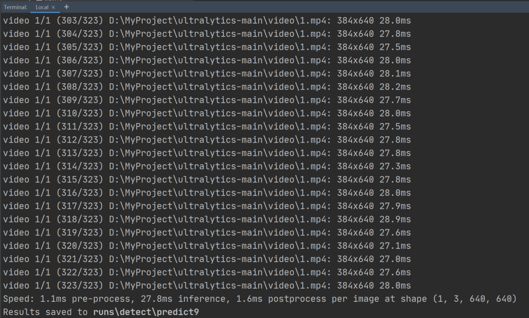 如需用训练后得到的数据集模型来训练视频,则把想训练的视频放在仓库主路径上,然后用以下代码(将“source=”后缀改成视频的路径)调用即可: