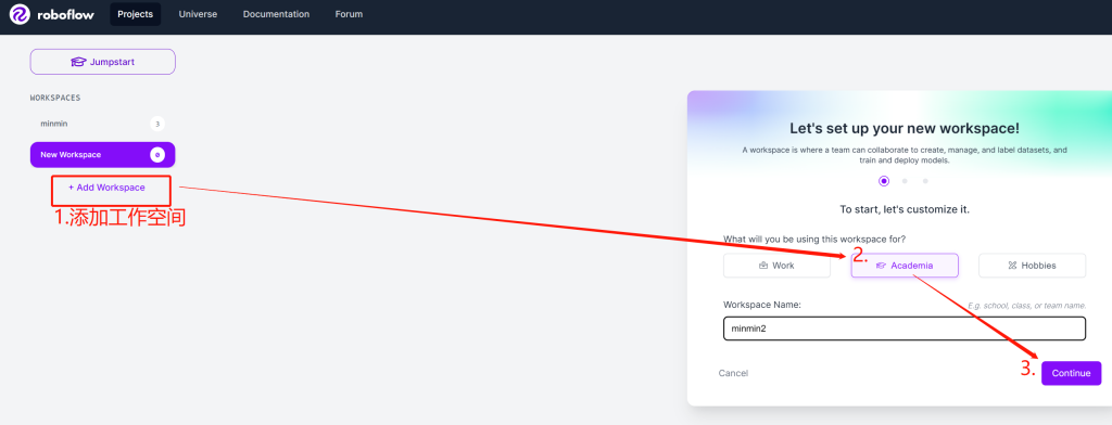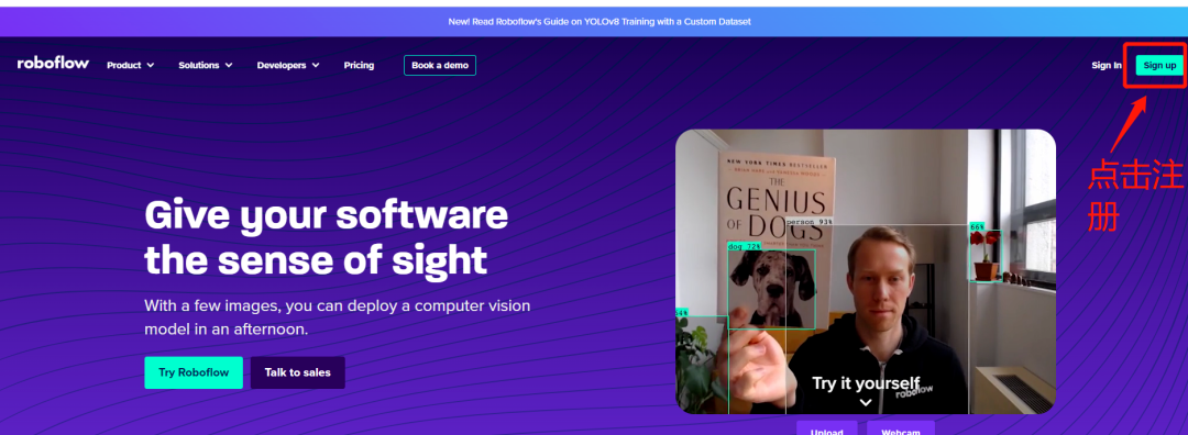 接着,使用Roboflow创建数据集。前往Roboflow官网点击右上角注册账号,然后通过Roboflow将自定义数据集进行标注并直接导出到 YOLOv8以进行训练。具体操作步骤如下: