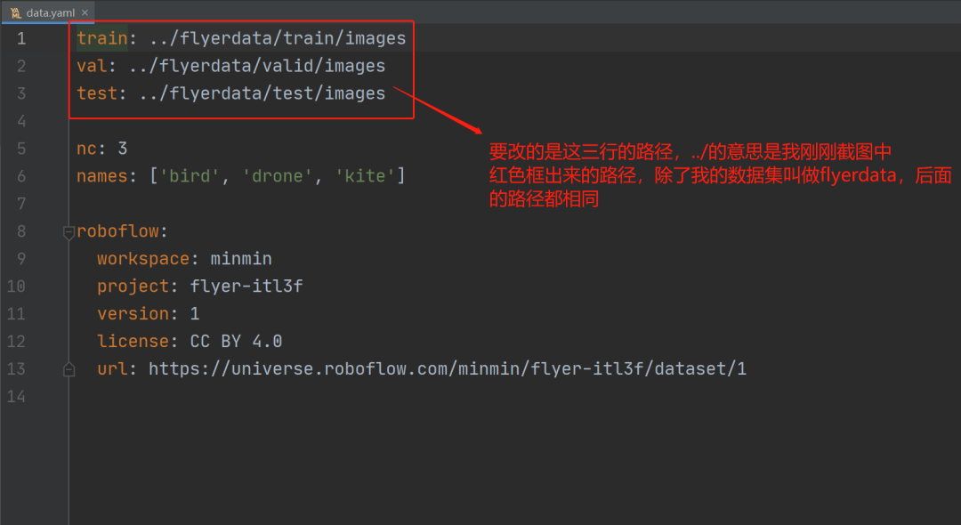 在“pycharm”打开自创数据集中的“data.yaml”,修改文件中的路径。