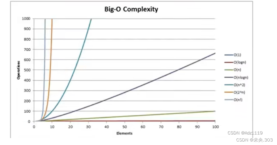 O(1)< O(log2(n))< O(n)< O(nlog2(n)< O(n^2)< O(n^3)< O(2^n)< O(n!)< O(n^n)