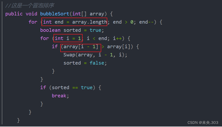 void bubbleSort(int[] array) {for (int end = array.length; end > 0; end--) {boolean sorted = true;for (int i = 1; i < end; i++) {if (array[i - 1] > array[i]) {Swap(array, i - 1, i);sorted = false;}}if (sorted == true) {break;}} }解析: