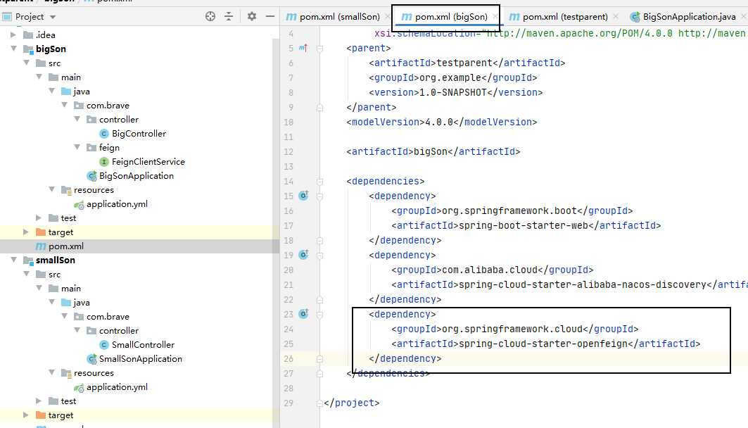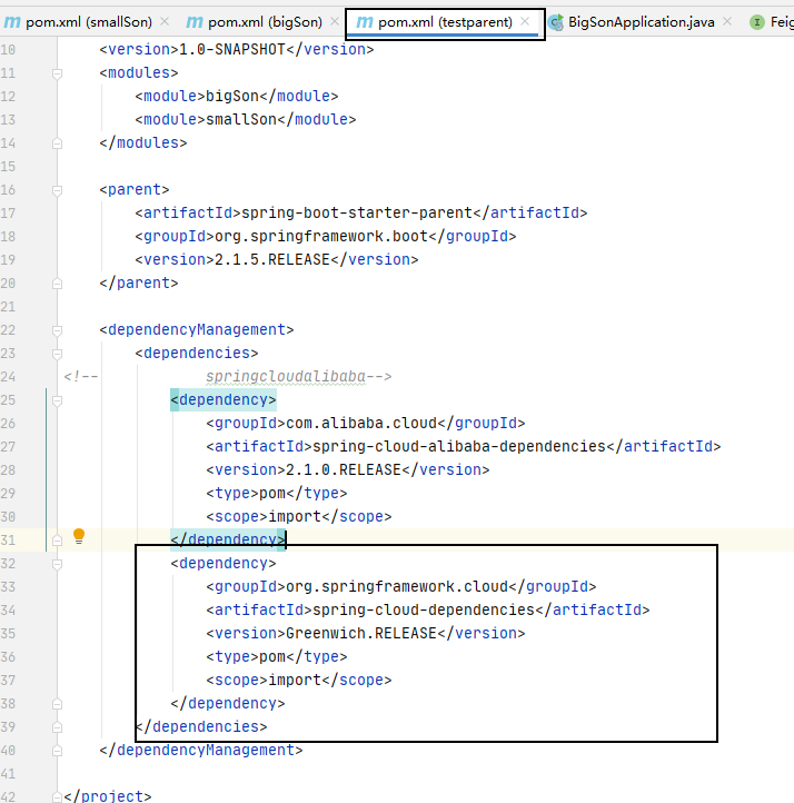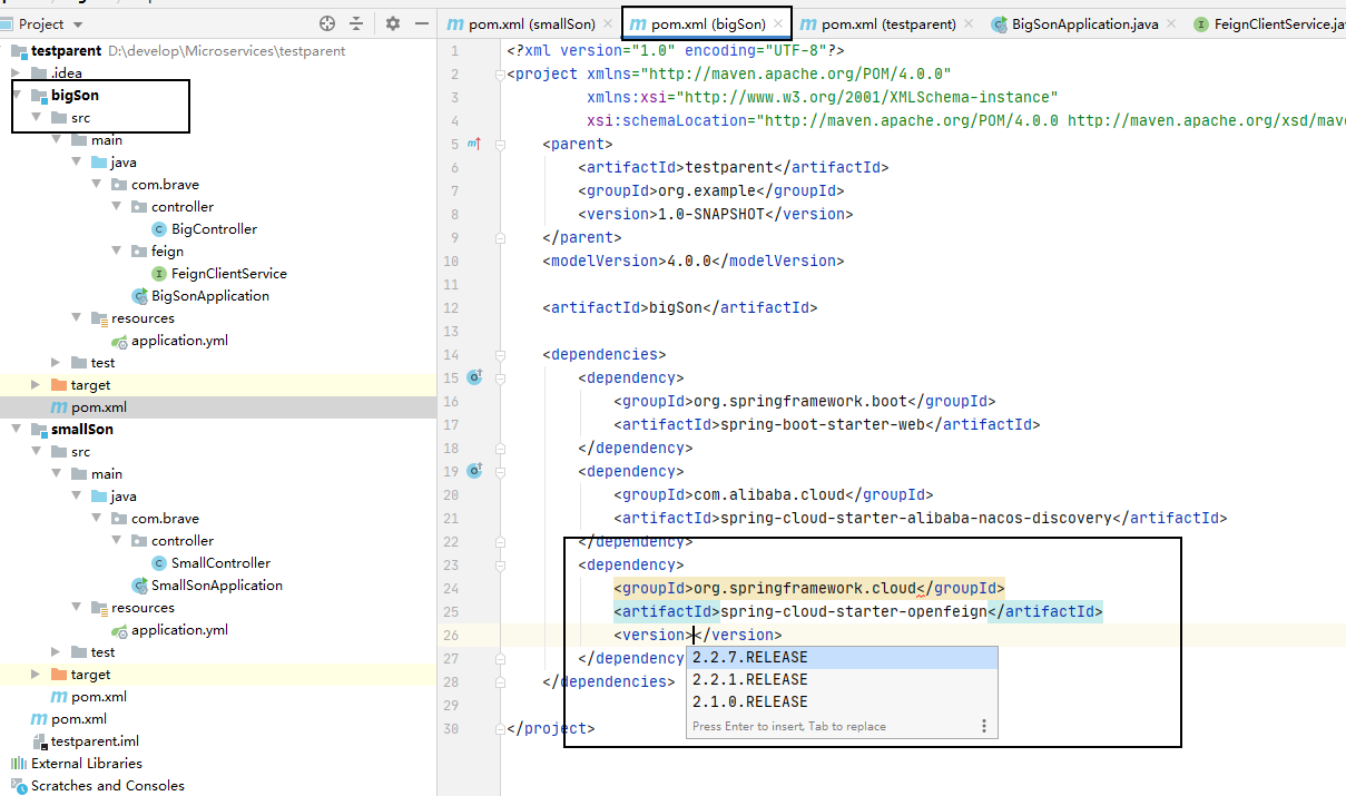 所以,首先,在服务A中添加feign的依赖,我这里就还用之前的bigSon去调用smallSon中的方法,但是发现在bigSon中添加Feign依赖的时候,需要我加版本号,这就不对劲了。