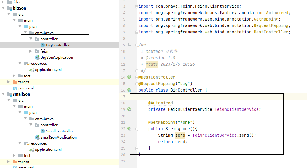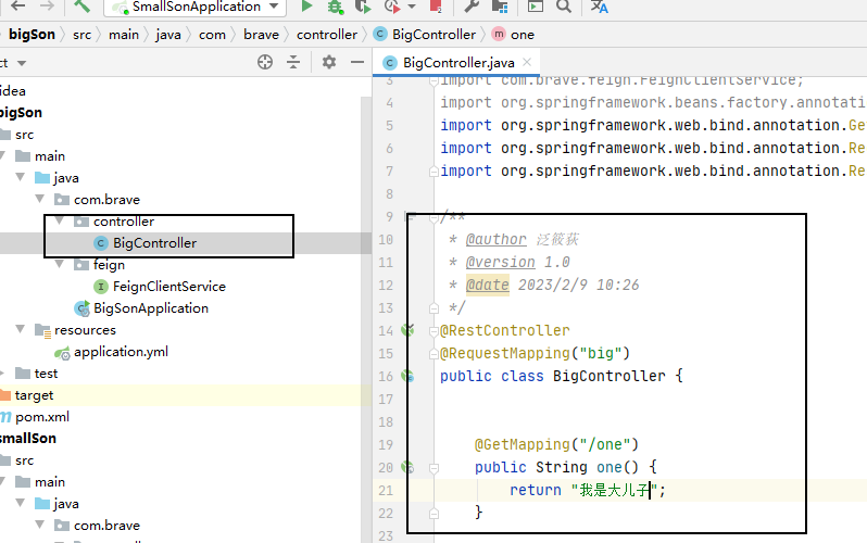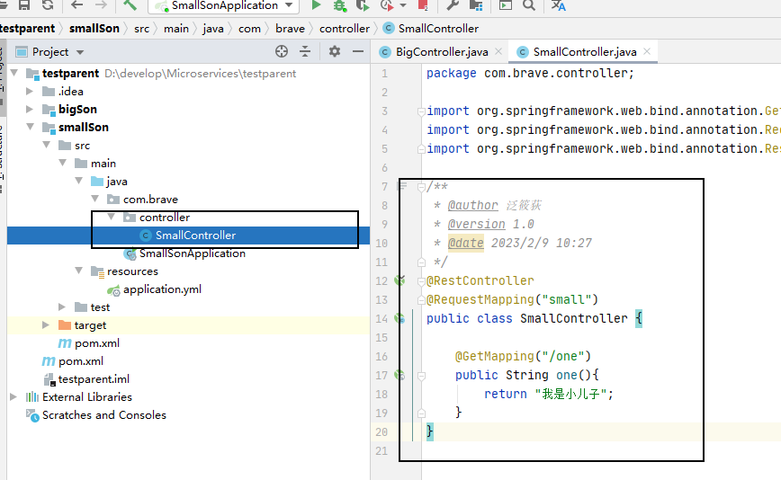 3、然后,我们分别在bigSon和smallSon中写两个controller