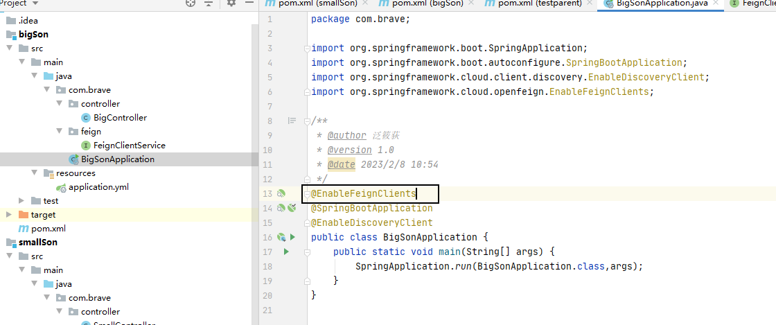 2、依赖加完,下一步就是在bigSon的启动类中添加注解