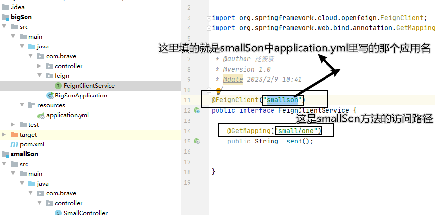 5、然后,就是在bigSon中写Feign的接口,在这个里面写一个和smallSon中的方法名一样的方法,写好服务名(应用名)和路径名