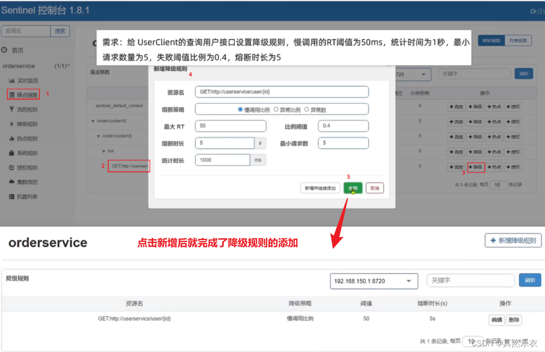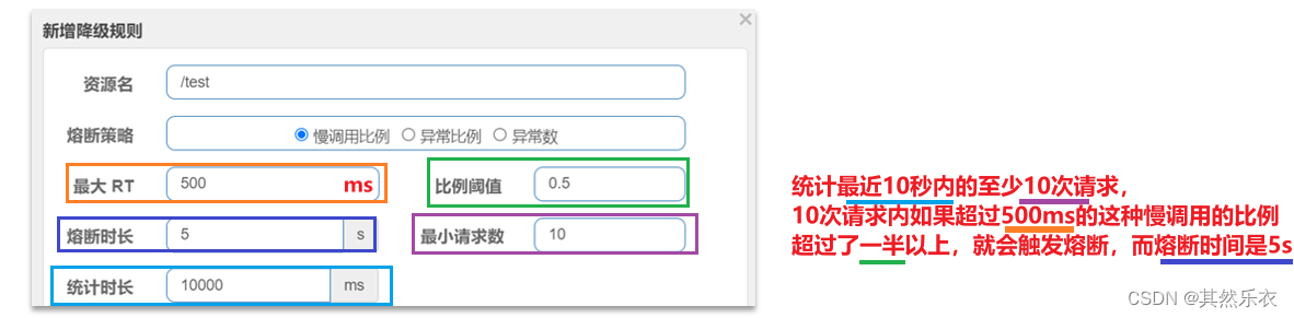 上面降级规则配置的解读:RT超过500ms的调用是慢调用,统计最近10000ms内的请求,如果请求量超过10次,并且慢调用比例不低于0.5,则触发熔断,熔断时长为5秒。然后进入half-open状态,放行一次请求做测试。
