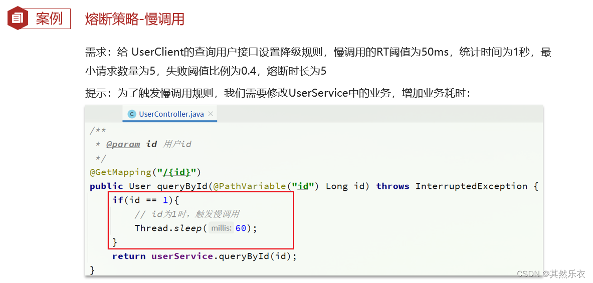 慢调用:业务的响应时长(RT)大于指定时长的请求认定为慢调用请求。在指定时间内,如果请求数量超过设定的最小数量,慢调用比例大于设定的阈值,则触发熔断。例如: