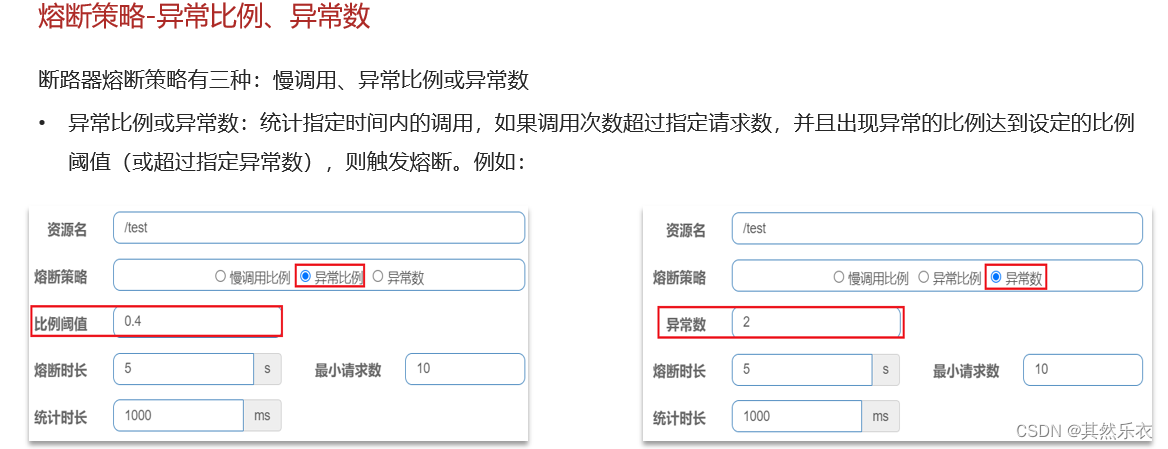 慢调用比例:超过指定时长的调用为慢调用,统计单位时长内慢调用的比例,超过阈值则熔断