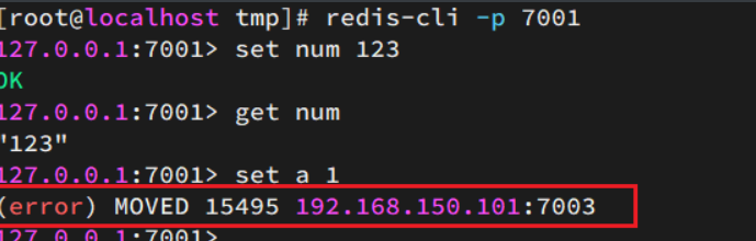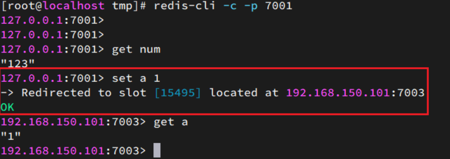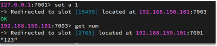 如图,在7001这个节点执行set a 1时,对a做hash运算,对16384取余,得到的结果是15495,因此要存储到7003节点。