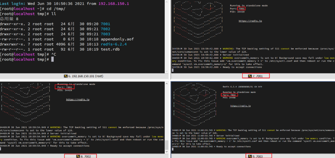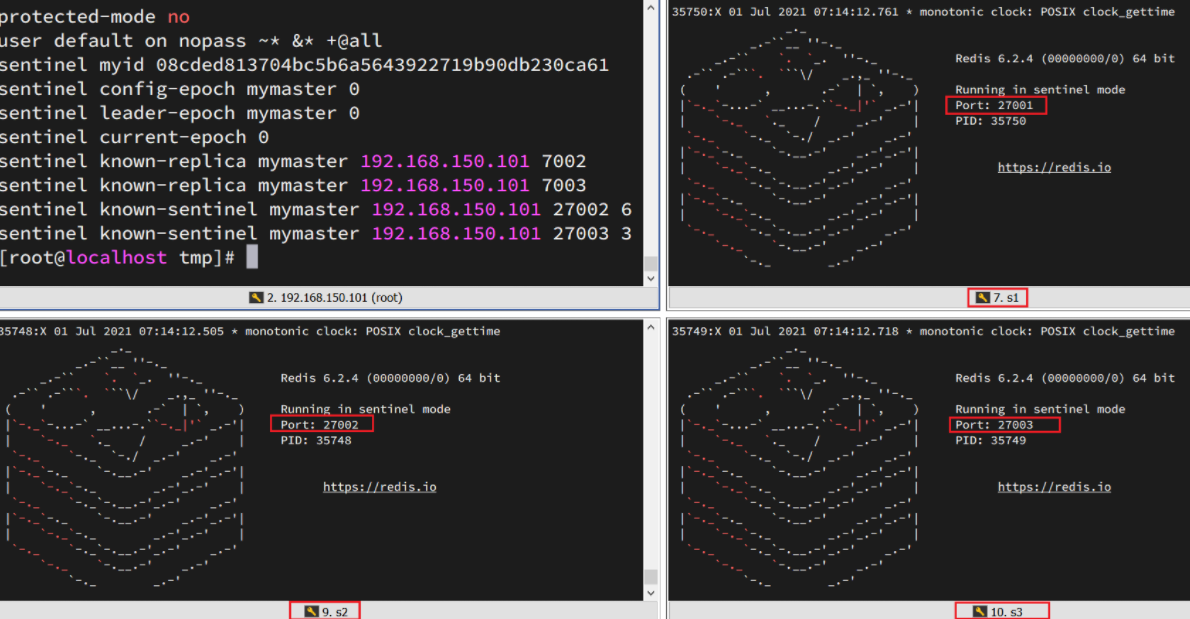 printf '%s\n' 7001 7002 7003 | xargs -I{} -t sed -i '1a replica-announce-ip 192.168.136.130' {}/redis.conf为了方便查看日志,我们打开3个ssh窗口,分别启动3个redis实例,启动命令: