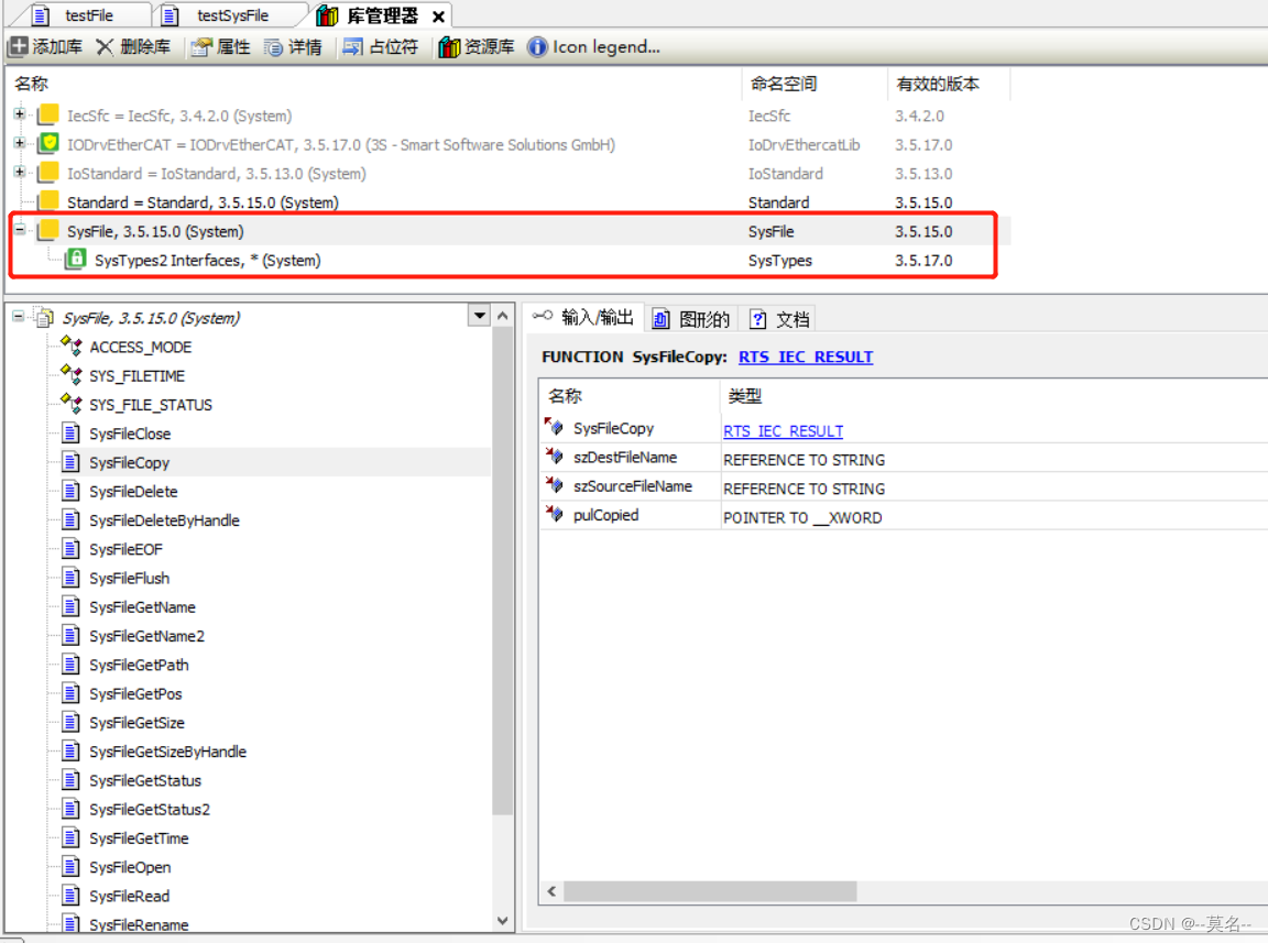 与上一期介绍的目录和文件操作库CAA File不同,SysFile属于CODESYS比较底层的库,其中结构和功能块的定义与C语言非常接近。使用该库需要在“库管理器”中添加SysFile库,这里使用的是3.5.15版本。