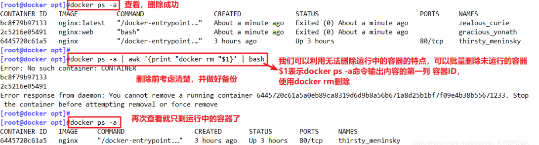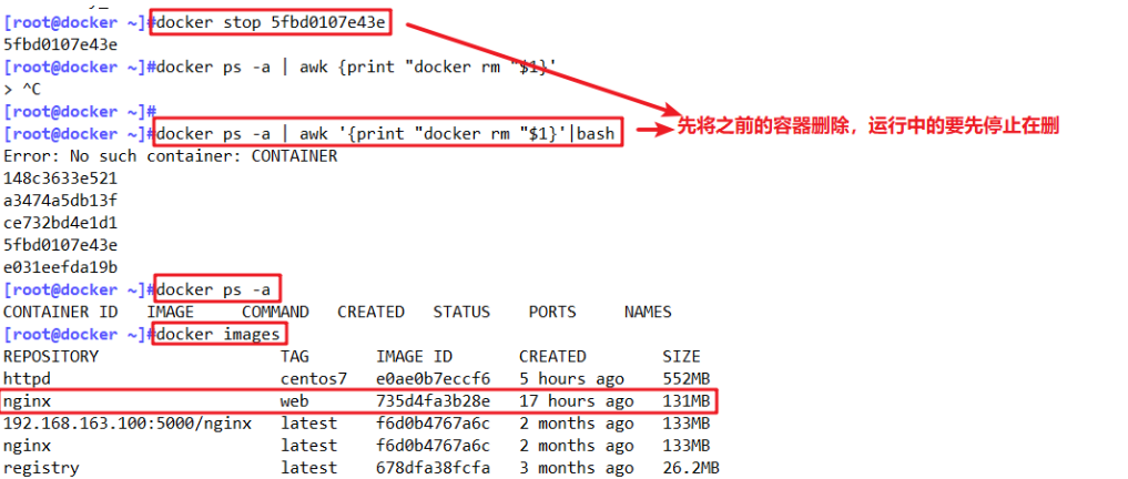 docker ps -a | awk '{print "docker rm "$1}' | bash
