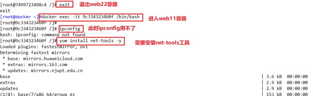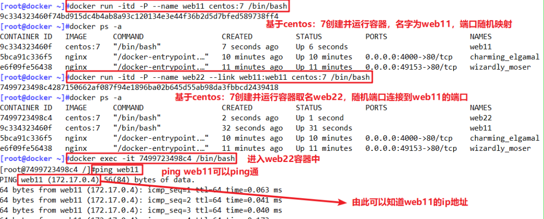 docker run -itd -P --name web11 centos:7 /bin/bash//创建并运行容器取名web2,链接到web1和其通信进web22容器 ping web1