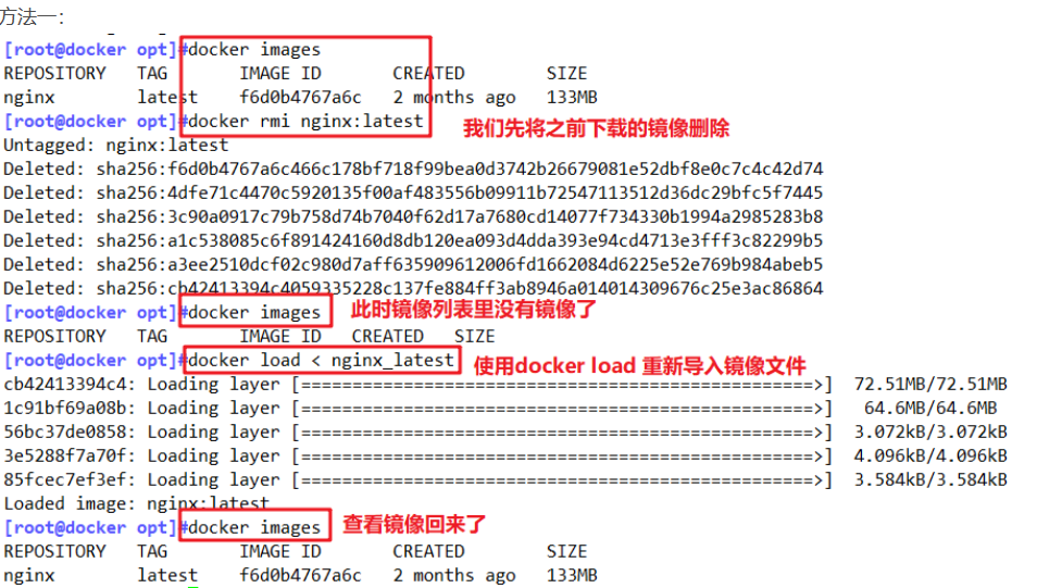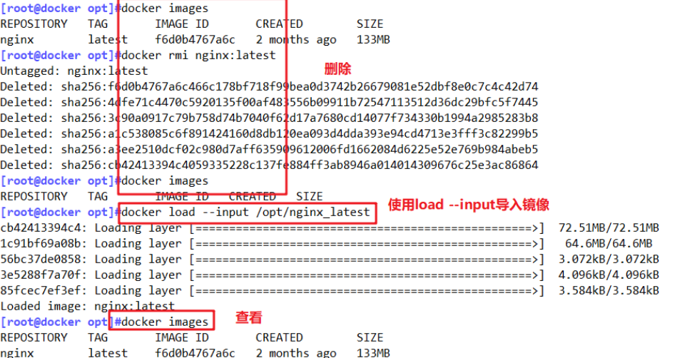 查找镜像(search)—上传(pull)、下载(push)—打标签(tag)—删除(rm)—导出(save)、导入(load)