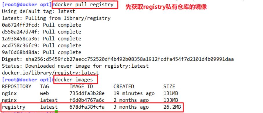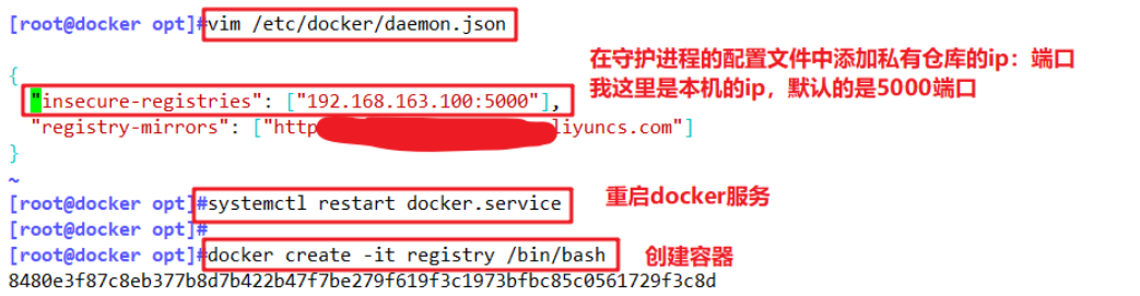 下载registry镜像—>运行容器、暴露端口5000—>修改daemon.json文件—>重启docker