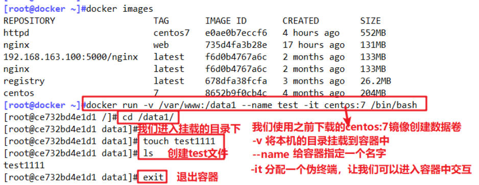 docker run -v /var/www:/data1 --name test -it centos:7 /bin/bashcd /data1/