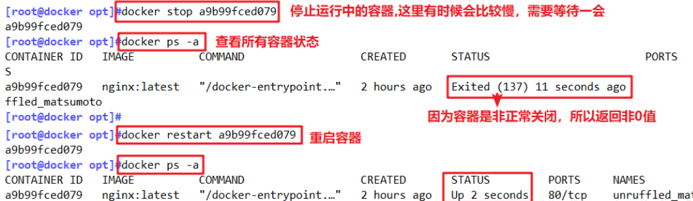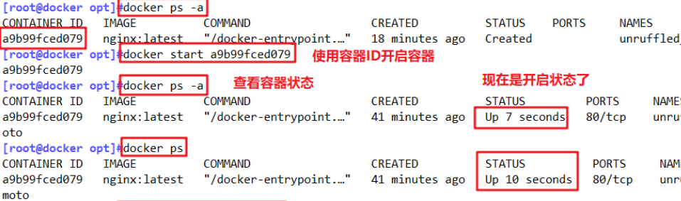 docker start 容器ID:启动一个或多个已经被停止的容器