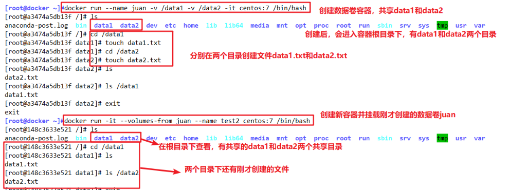 docker run --name juan -v /data1 -v /data2 -it centos:7 /bin/bash
