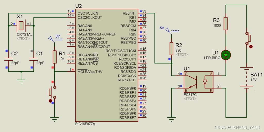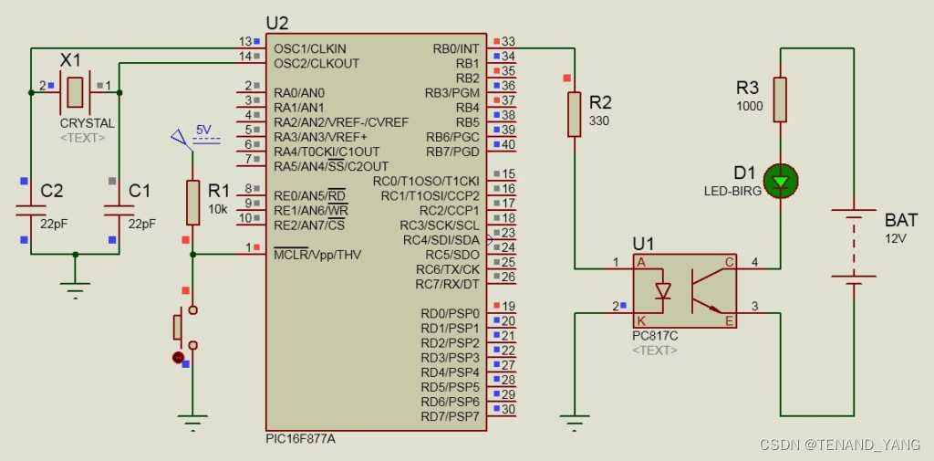 图 2:显示 PIC16F877A 微控制器 (U2) 和 PC817C 光耦合器 (U1) 之间连接的电路图。光耦合器用于切换LED(D1)。晶体管和继电器可用于开关电压相对较高的负载。