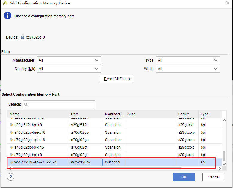 4.将上述表头填写完整保存excel表格并替换原有表格,重新打开vivado hardware manager,选择添加存储器件,可以看到,新加入表格的华邦Flash已经可以添加了。