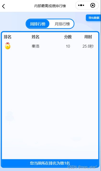 7、内部成绩排名,实时查询内部最高成绩排行榜,按周、月维度区分,显示排名、姓名、分数、用时等数据指标。还有导出当前数据的功能;