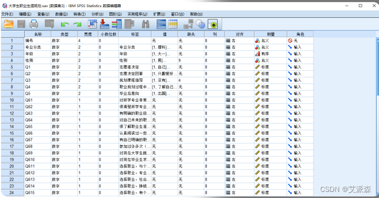 变量视图:变量视图选项卡用于显示、编辑SPSS数据的结构。