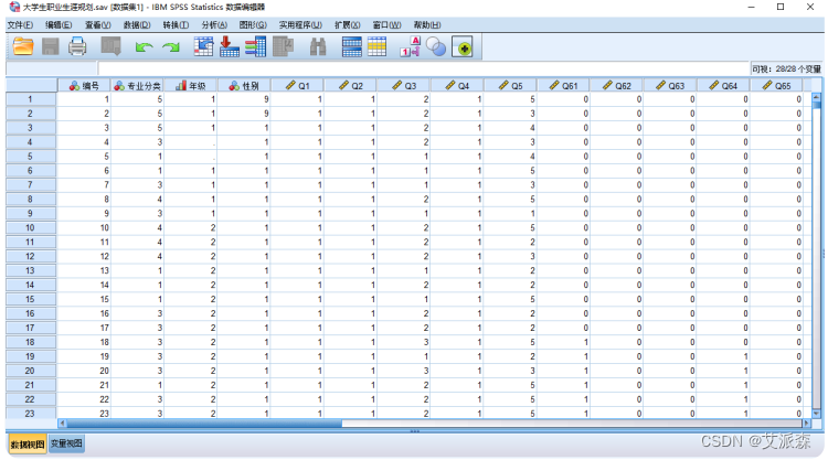 数据视图:数据视图选项卡用于显示、编辑SPSS数据的内容