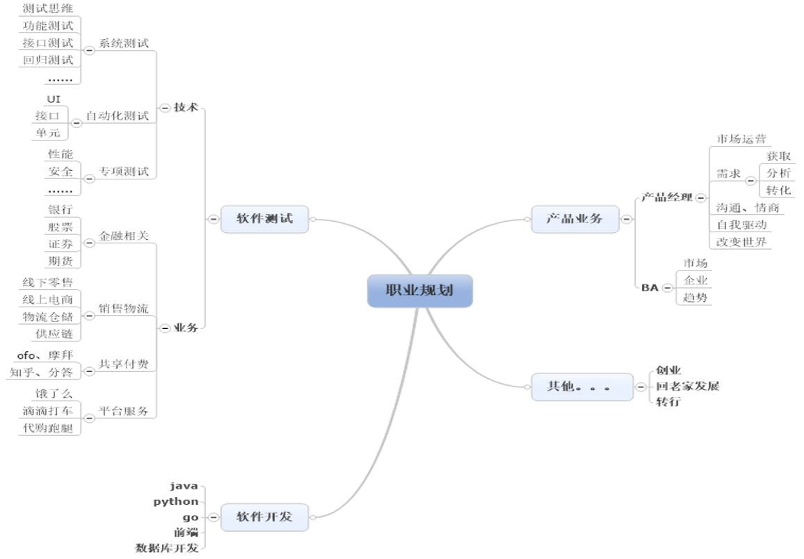 不知道其他同行是如何看待职业发展规划这个话题的,我个人目前的看法,大概就是下面这个思维导图的样子: