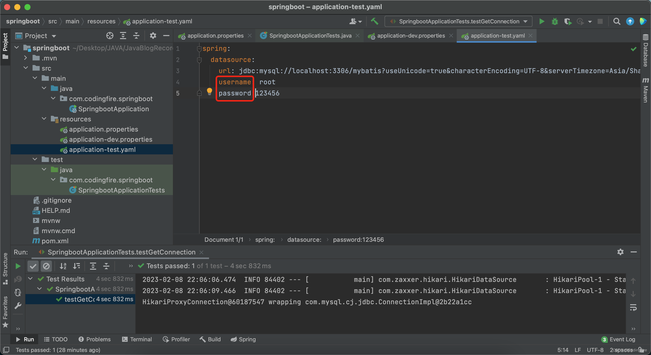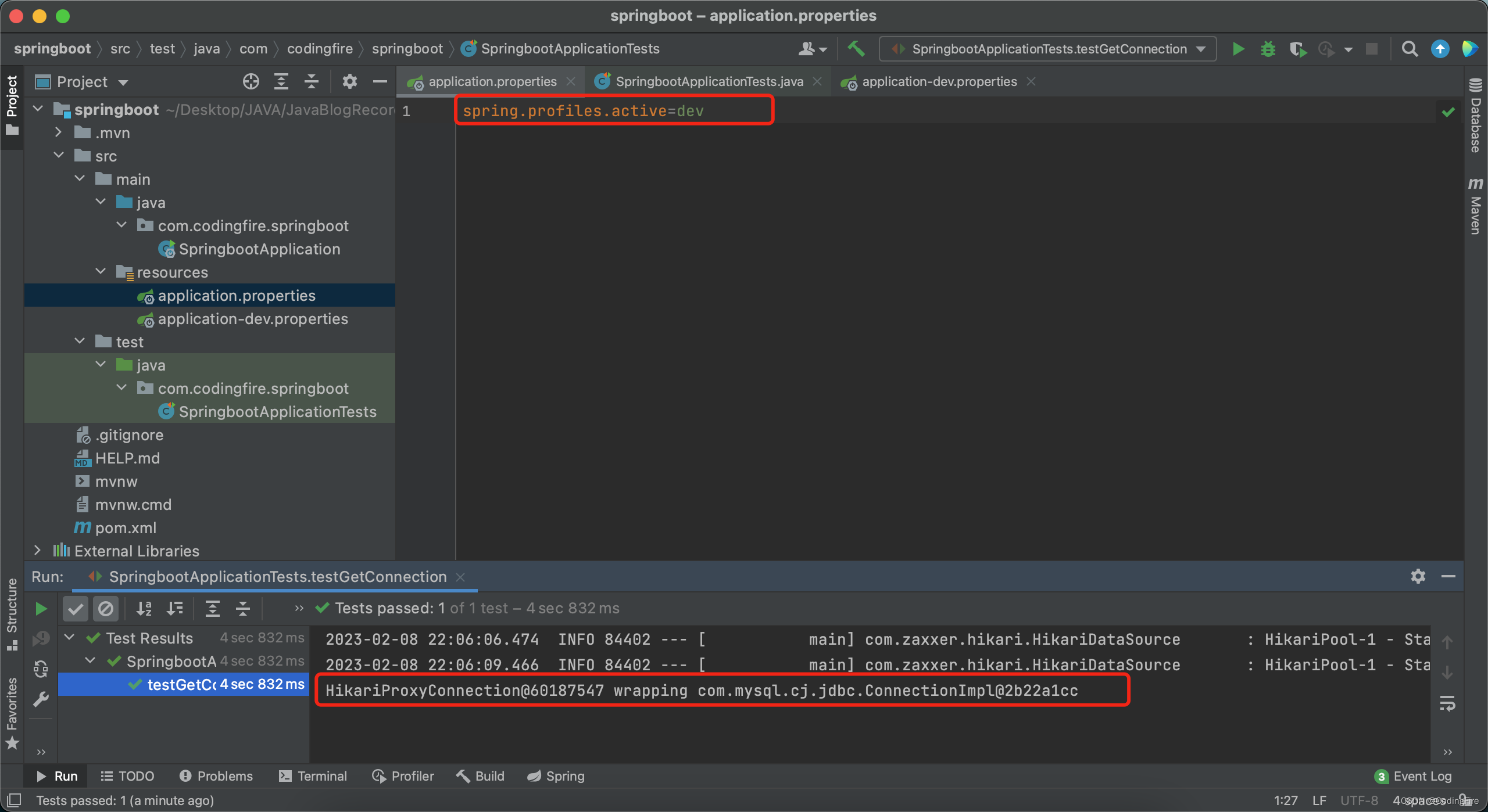此时 application.properties文件中只有这一句配置即可,原来的url等信息都需要放在dev所对应的配置文件中。接着我们重新运行上面的测试代码,发现运行成功,依然可以获取到配置中所包含的数据库信息。