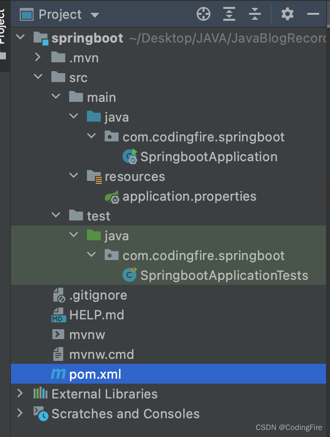 Spring Boot创建时我们看到有Maven字样,所以其本质上也是一个Maven工程,所以和我们的SSM框架的项目区别并不大。展开文件目录,发现还是有些不一样的。