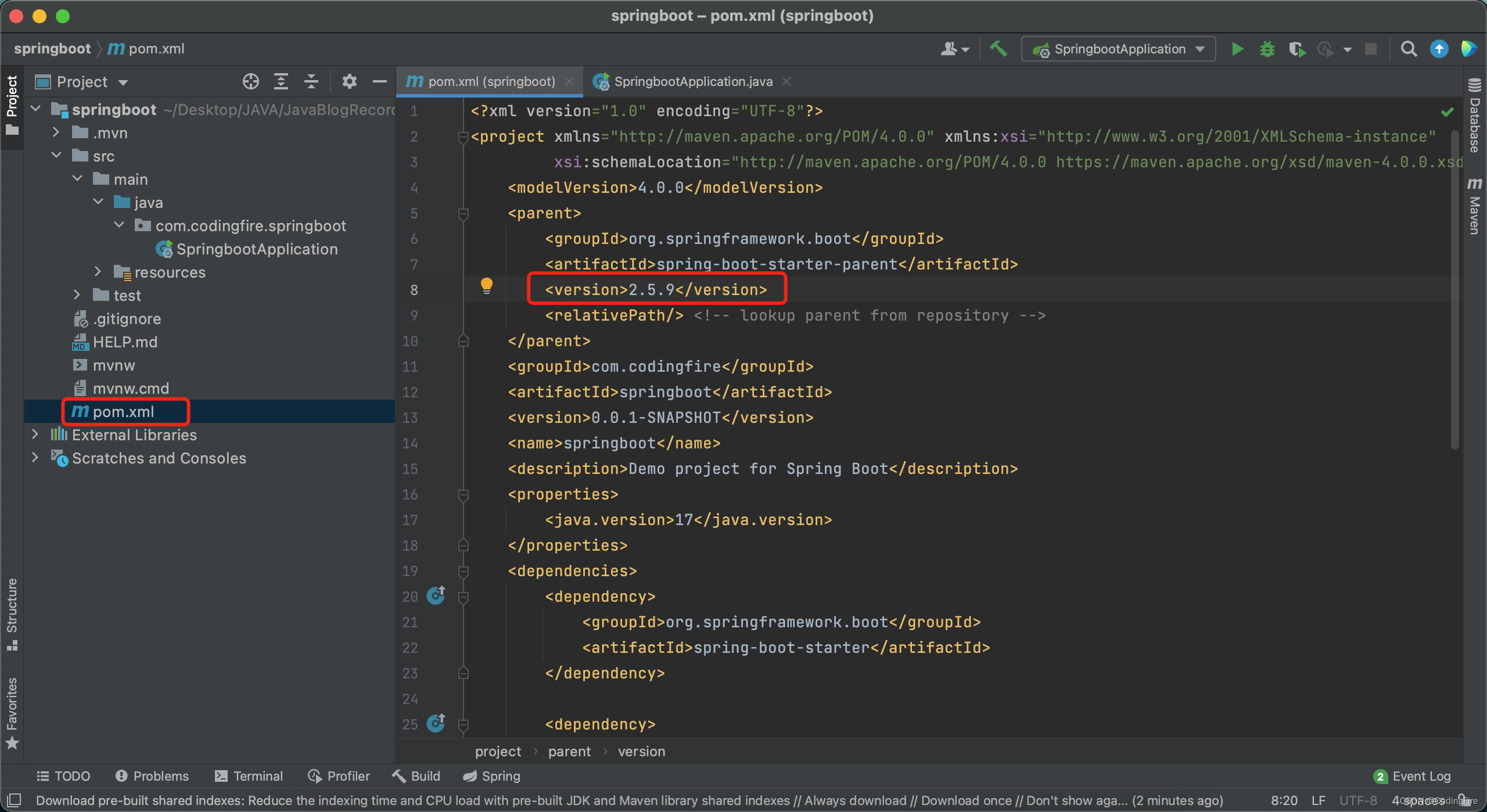 在此图中,pom.xml文件内修改Spring Boot的版本为2.5.9,这个版本博主目前使用中没遇到问题。修改完后记得右上角的刷新按钮刷新一下,这个在SSM框架中我们已经比较熟悉了。