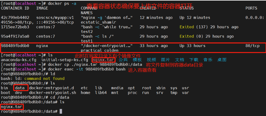 格式:docker cp 文件路径 容器id:目录#当前家目录下有一个myapp.tar文件 把他复制到容器里