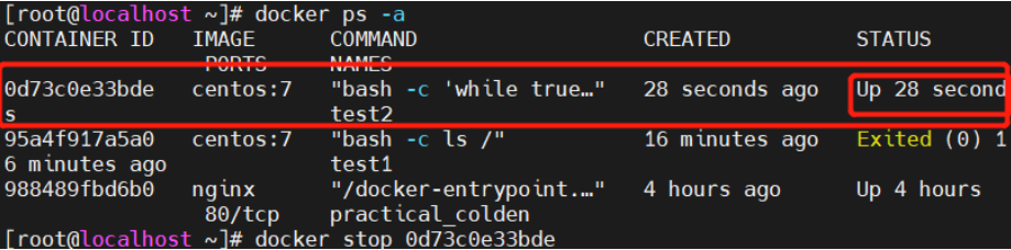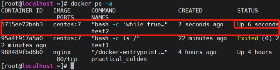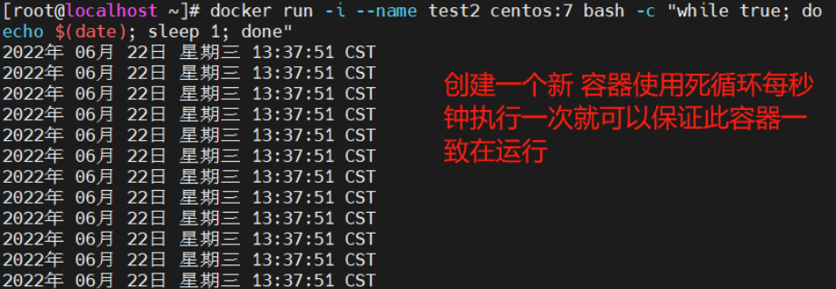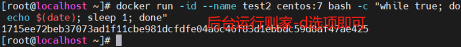 docker run -id --name test2 centos:7 bash -c "while true; do echo $(date); sleep 1; done"