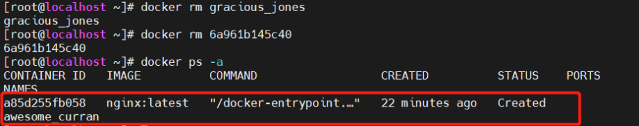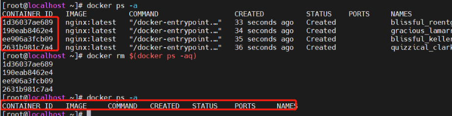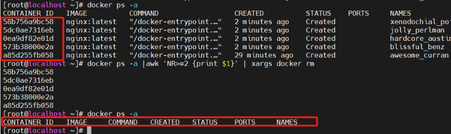 docker ps -a |awk 'NR>=2 {print $1}' | xargs docker rm